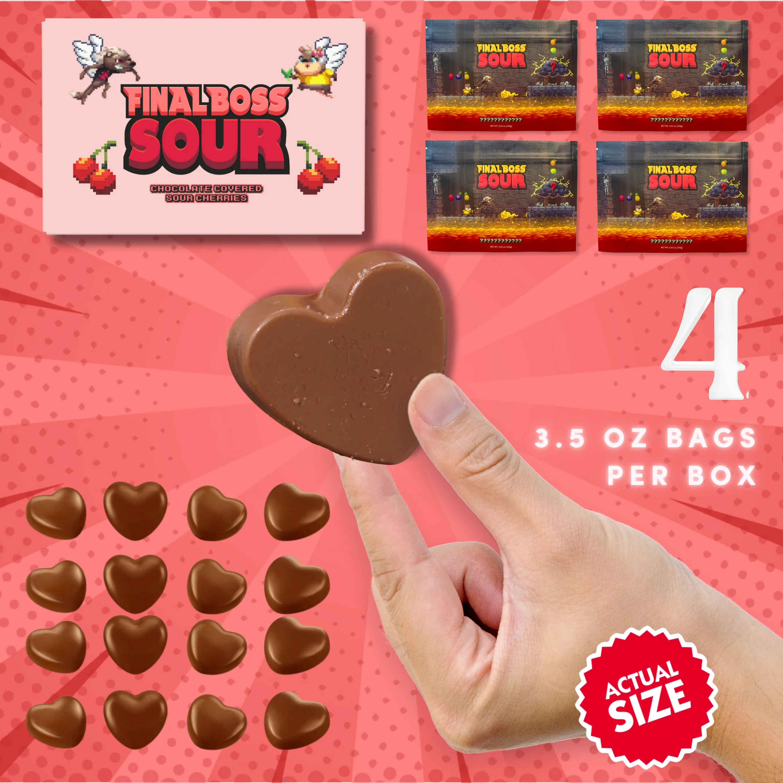 Each order includes 4 of our standup 3.5oz resealable larger pouches filled with heart-shaped chocolate covered sour cherries!